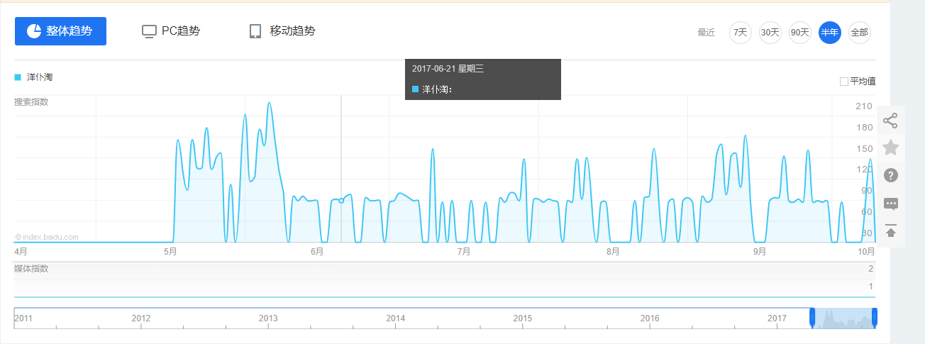 上图是一个公司品牌词的指数,大家可以发现其波动范围是很大的,有时候很高,有时候很低甚至没有,同时会发现在搜索量低的时间一般是在周末、节假日,这个不难明白,这段时间公司的运营人员一般都在放假,没有开电脑自然不能刷指数。文章源自www.xlme.cn川渝圈-https://www.xlme.cn/3999.html