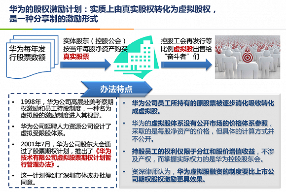 2、虚拟股模式 虚拟股并不是真正的公司股份,比如华为的虚拟股,本质上是一种分享制。可以将公司或者事业部资产换算成多少股,然后授予员工一定数量的虚拟股。虚拟股有分红权和资产增值收益权。这种模式对财务核算要求比较高,要特别设置好进入、调整、退出机制,特别是退出时的资产增值收益。文章源自www.xlme.cn川渝圈-https://www.xlme.cn/7906.html