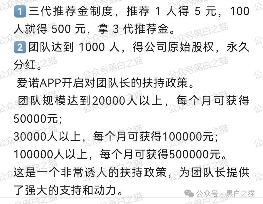 从相关外宣内容上看,踩红线居多,延续了扶贫类糖衣炮弹模式,推广三代佣金制、股权激励和分红、团队达到3000人可建立爱心驿站等。