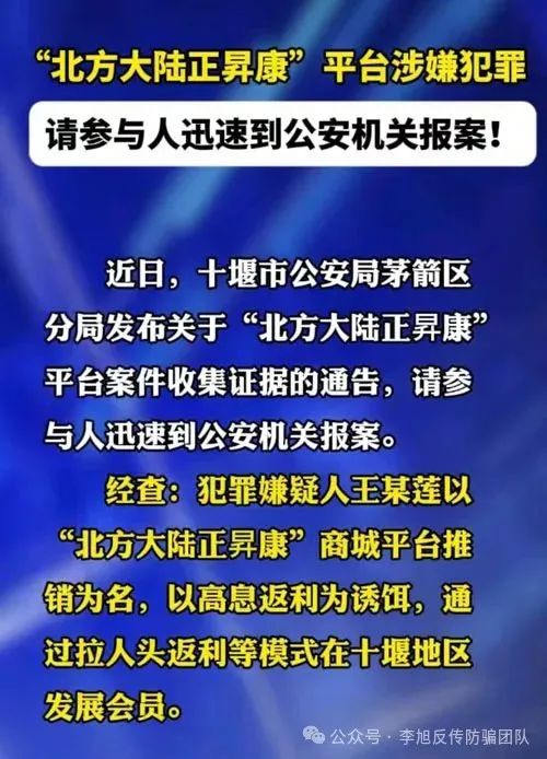 近日,市公安局茅箭区分局立案侦办的王某莲等人涉嫌犯罪一案进入证据收集的关键阶段,经查:犯罪嫌疑人王某莲以“北方大陆正昇康”商城平台推销为名,以高息返利为诱饵,通过拉人头返利等模式在十堰地区发展会员。